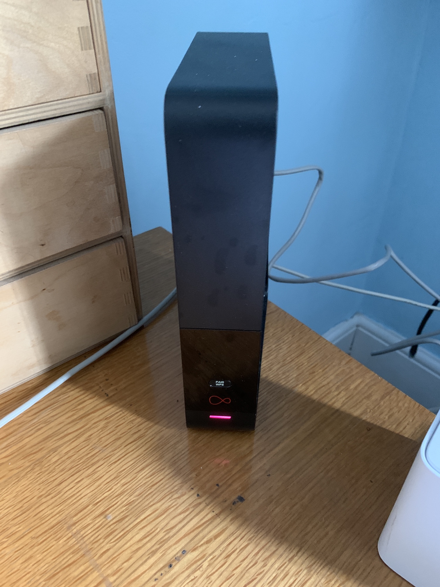 So I call Virgin and, after 30 minutes, get through to someone in Bangalore. “It means it’s overheating,” they say. “Turn it off and turn it on again.” I explain that I have already done this, that it’s not hot where we live, and that there are no nearby fires etc. “It’s nothing to worry about,” they say. “Just leave it.” But a red light signals danger, I say. The light should be white.