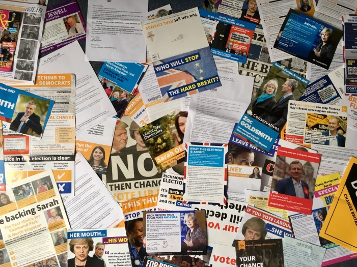 There. It’s over. Apart from the actual voting part. But as far as campaigning for the 2017 general election goes, that’s about it. The last leaflet fell through our letterbox just an hour ago. Like the majority of other campaign comms, it was from the Liberal Democrats. The fact that I have a giant, unmissable LibDem diamond-shaped signboard nailed to a tree at the entrance to our house hasn’t deterred canvassers from thinking that maybe I might change my mind, or that I’m not that committed. Neither has the fact that I volunteered to help with their campaign. I’m ‘known’ to the local party, so one would have thought my property would be spared. But no. Nothing has stopped the deluge of letters, leaflets and newspapers from arriving almost every day.