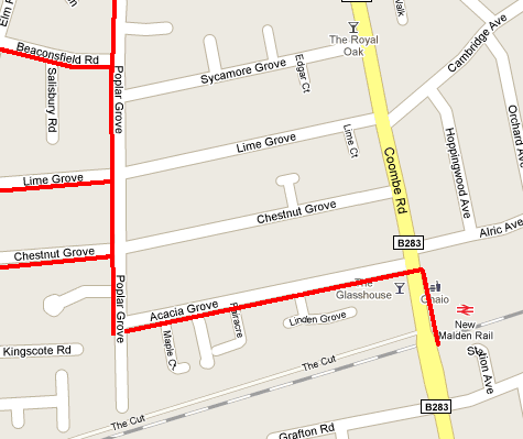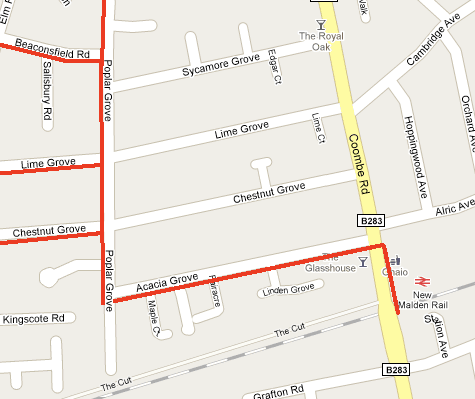 The other reason is down to perception. I think there’s a widespread assumption that Poplar Grove runs parallel to New Malden High Street. So anyone approaching Poplar Grove would see the road they’re on appear to bend to the left, or north, after the intersection. In other words, it would seem to take them further away from their destination.